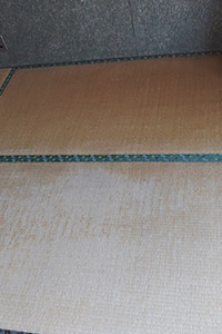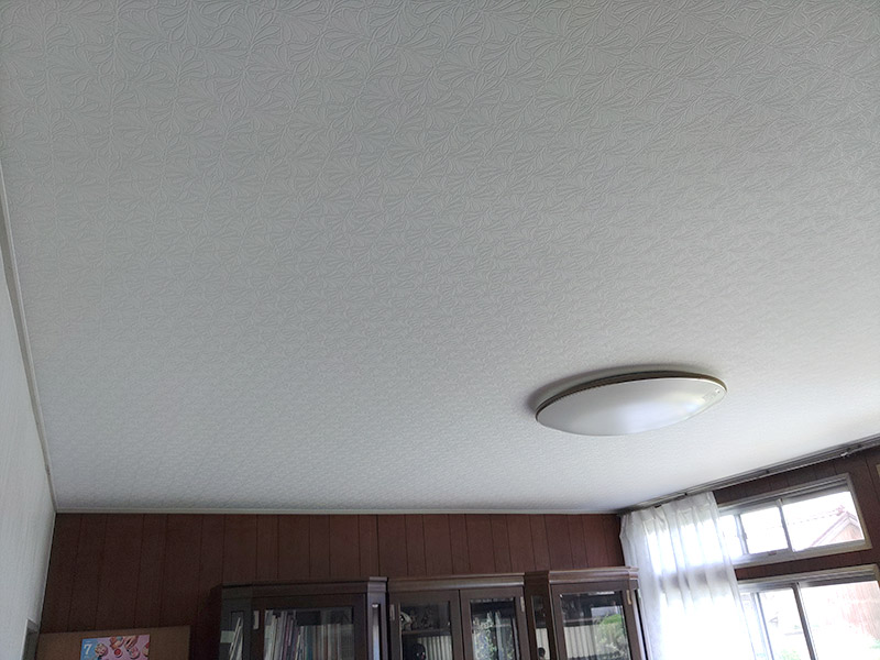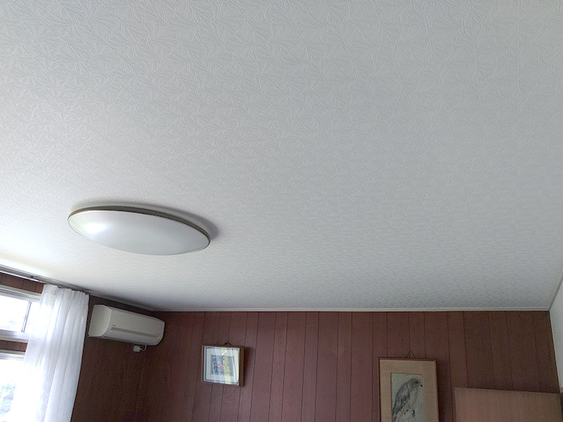 居間の天井は、当初クロスの貼り替えでご依頼をいただきましたが、下地の薄べニアに劣化が確認できたため、5.5mmべニアを上張りするご提案をさせていただきました。